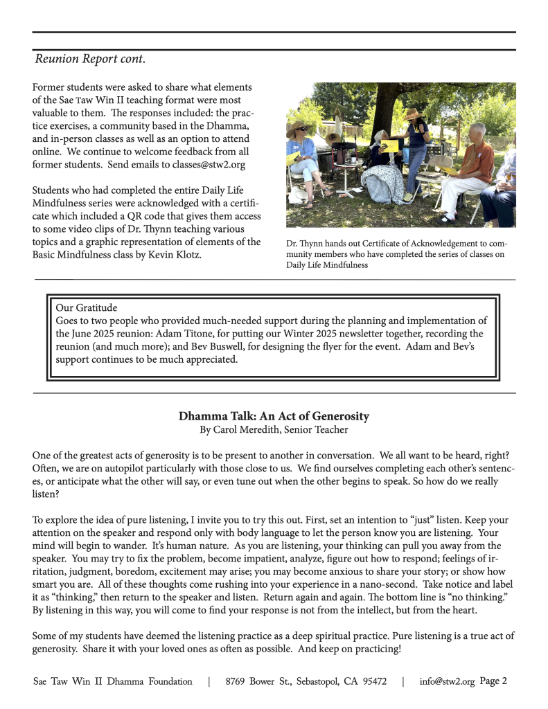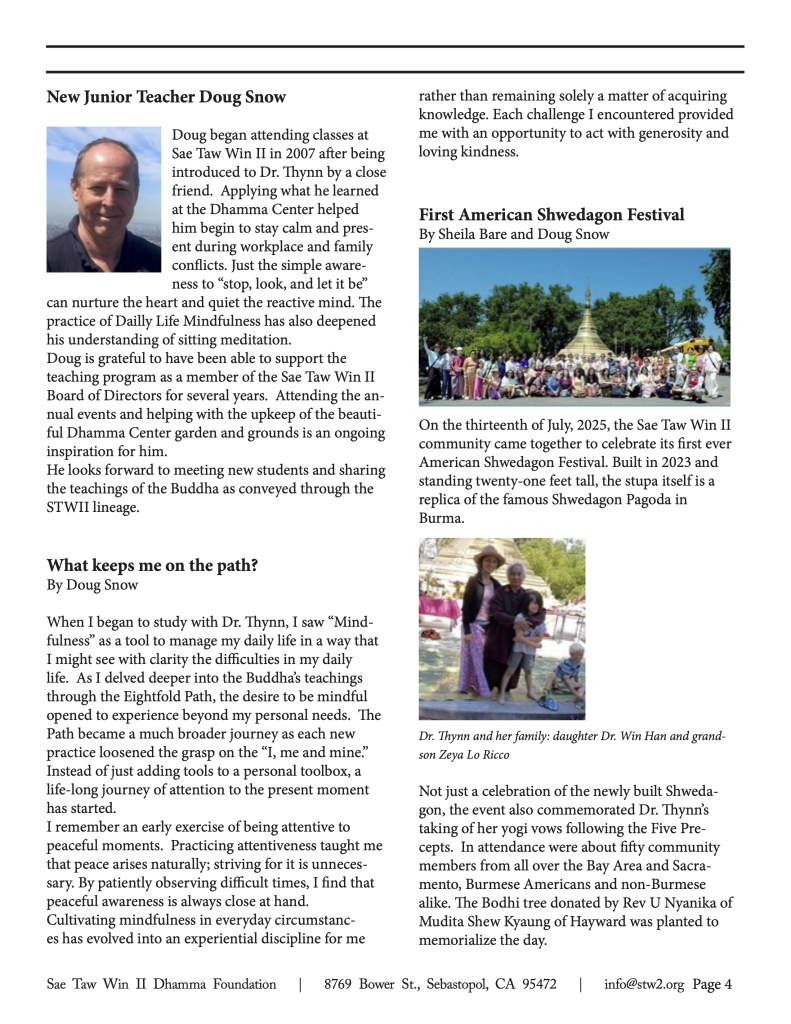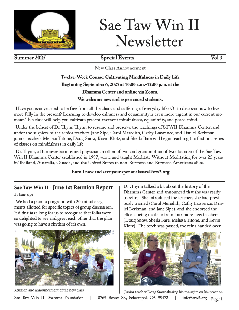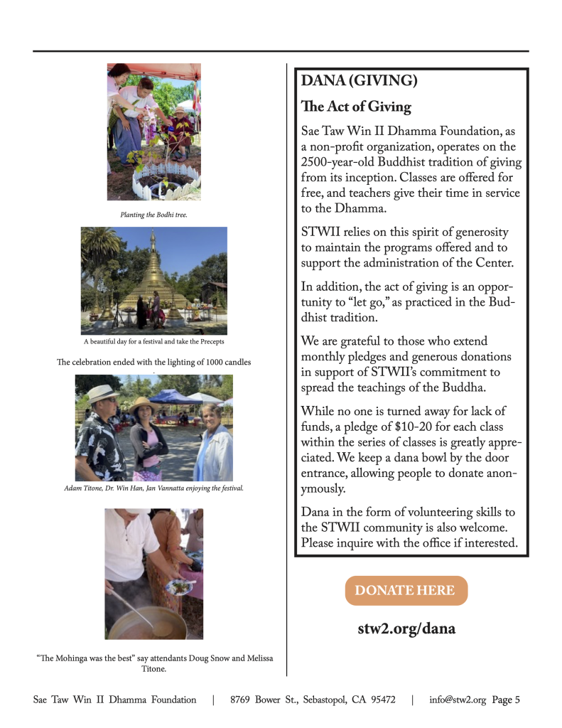 Sae Taw Win II Dhamma Foundation has operated on this 2,500 year old Buddhist tradition since its inception. Classes have been offered for free and the teachers offer their time in service to the Dhamma.