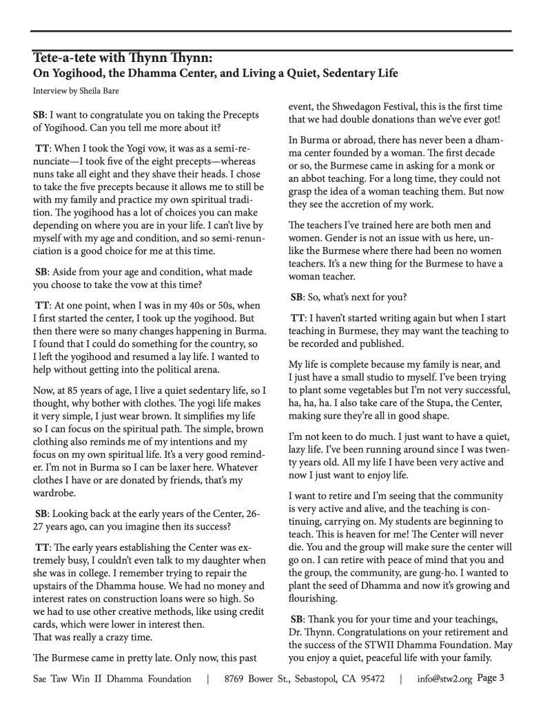 thynnmetta@gmail.com. I will then send our bank account number to you to set up auto-matic transfer on monthly basis. This will be the lifeline for the Center to keep the teach-ings to go on and continue our teacher training which virtually stopped when I got very sick in 2012.